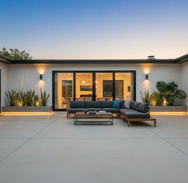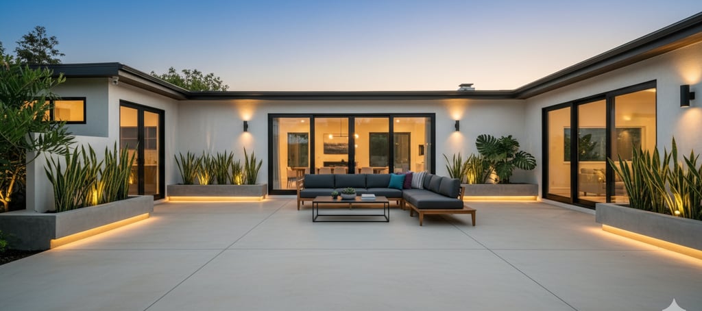 Picture a spacious patio with smooth concrete flooring, a low-profile sectional sofa, and a modern coffee table placed in the center. A few carefully chosen plants add greenery without overwhelming the space. At night, subtle LED lighting highlights architectural features and creates a calm atmosphere.