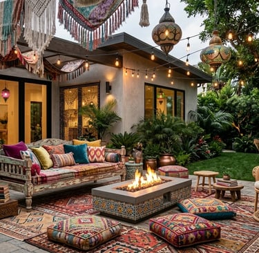 Imagine walking into a backyard where soft string lights glow above colorful floor cushions and a wicker chair gently sways in the breeze. Plants surround the seating area, creating a peaceful escape from the busy world outside. That’s the magic of a boho patio.
